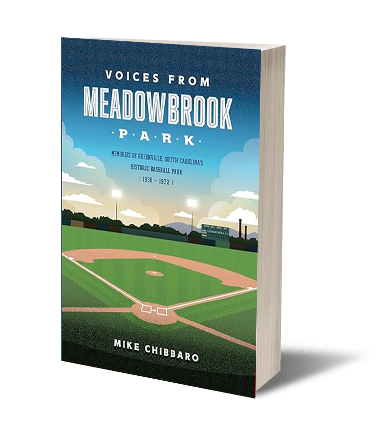 Mike Chibbaro tells stories about the construction of a historic 1938 minor league baseball park in Greenville, South Carolina. It became known as Meadowbrook Park and for the next 34 years, it was the home to a scrapbook full of sacred baseball memories. An impressive list of 40 Hall of Famers appeared at the historic park. Meadowbrook’s professional teams were the Spinners, Braves, Mets, Red Sox and Rangers. Nearly a hundred players from these teams played in the major leagues.